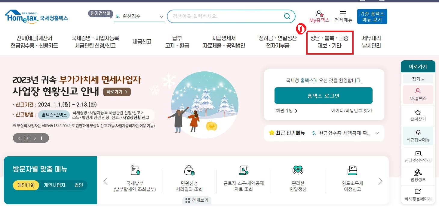국세청 홈택스에 접속하셔서 상담. 불복. 고충 제보. 기타를 클릭해 줍니다.