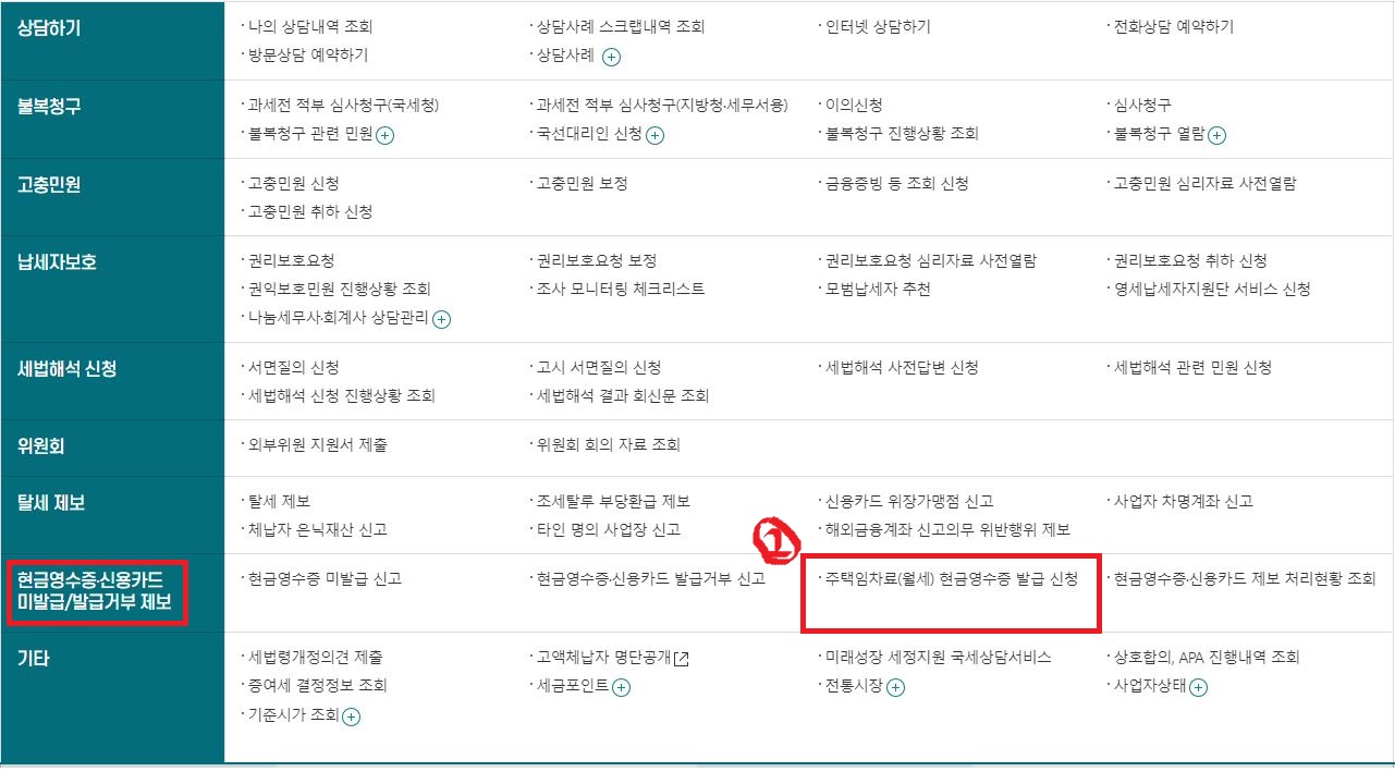 관련 메뉴가 나오면 주택임차료(월세) 현금영수증 발급 신청을 클릭 후 신청해 주시면 됩니다.